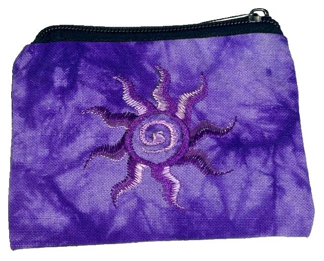 These mystical Tie Dye Coin Purses feature hand-embroidered sacred symbols on tie-dyed cotton canvas. Choose from celestial suns in silver on midnight blue, emerald on forest green, or golden flames on rose pink, plus cosmic purple spiral or ocean fleur-de-lis designs. Each purse is mindfully crafted in Nepal with secure zipper closure, perfect for carrying life's small treasures while celebrating spiritual artistry.